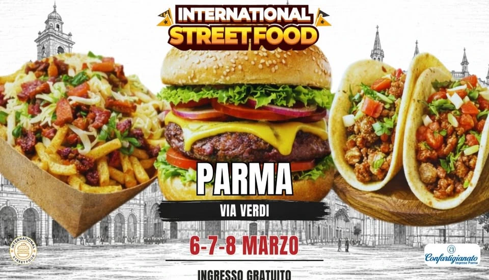 🍔 Dal 6 all’8 marzo 2026 l’International Street Food Festival fa tappa a Parma, portando in Via Verdi tre giorni dedicati ai sapori d’Italia e del mondo.