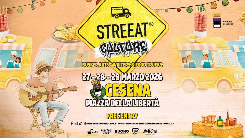 🚚 Dal 27 al 29 marzo 2026 Piazza della Libertà ospita a Cesena lo STREEAT® Food Truck Festival – Street Culture, il primo festival itinerante dedicato al cibo di strada in Italia, in tour dal 2014.